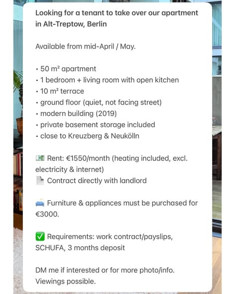 The listing is for a tenant to take over a rental contract for a 1-bedroom apartment in Alt-Treptow, Berlin, with a monthly rent of €1550 and requires purchasing furniture from the current tenant.