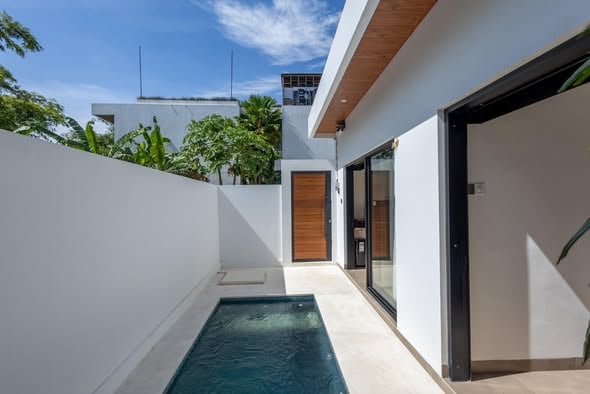 This listing is for a newly built one-bedroom villa located in Padonan, just 7 minutes from Canggu, featuring an enclosed kitchen and living room, with a private pool and rooftop.