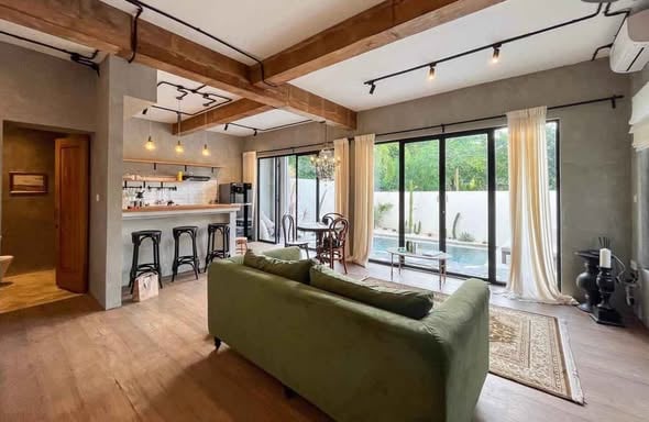 This Lovely Bohemian European 2 BR🦋 BATUBOLONG - near avocado factory / crate🥑🍞🥗 just 4 mins to the beach Will be available APRIL 1,2026 36/ month 370 / yearly 2 BR 2 bathroom [ one downstair one upstair ] Enclosed livingroom ac Private pool 1 Working desk Parking and access BIKE ONLY PM for Viewing