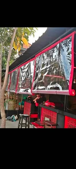ready stok segala macam krey seperti krey bambu, krey kayu bengkirai, tirai plastik pvc dan tirai kain waterproof untuk di jadikan penghalang panas dan tampias hujan, minat hub 082213172753 sudah free ongkir sama pemasangan.