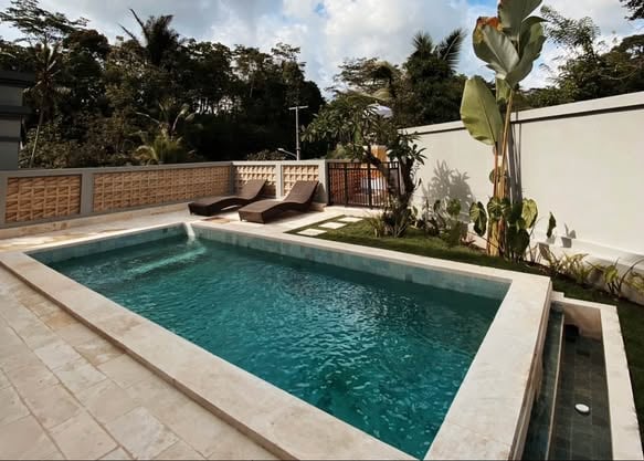 This listing is a modern villa for rent in Gianyar, featuring two bedrooms and a private pool, offering a serene nature ambiance.