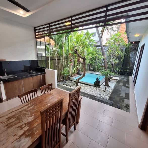 2-bedroom house for yearly rental in Muding Kerobokan area, featuring a small garden and semi-furnished layout.