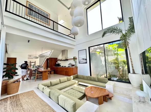 This brand new 3-bedroom villa in Seseh offers a fully furnished space with an enclosed living room, but exceeds the user's budget and bedroom requirements.