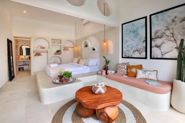 This 3-bedroom villa in Umalas is available for rent, ideally situated between Seminyak and Canggu, and includes amenities like a cleaner and WiFi.